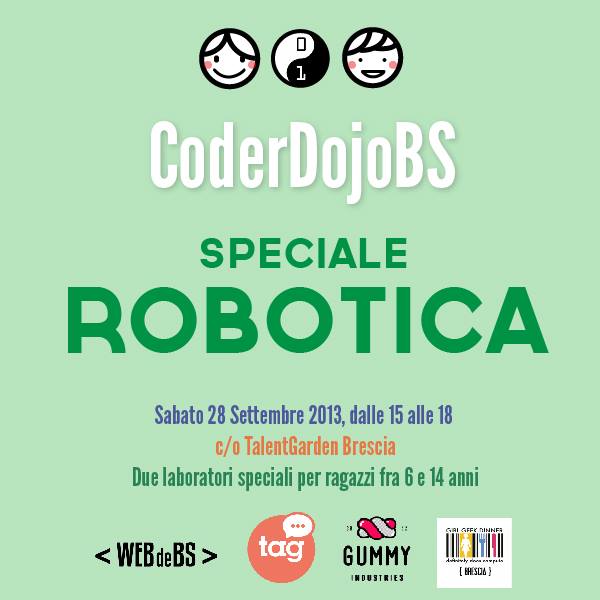 Sabato 28 settembre 2013 dalle 15.00 alle 18.00 torna il CoderDojo a Talent Garden Brescia: un appuntamento dedicato alla Robotica per i ragazzi dai 6 ai 14 anni.